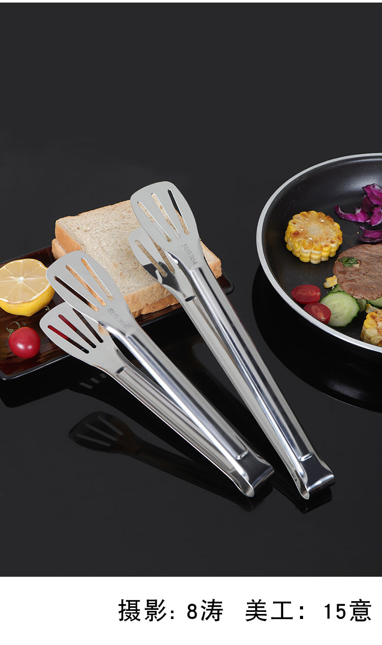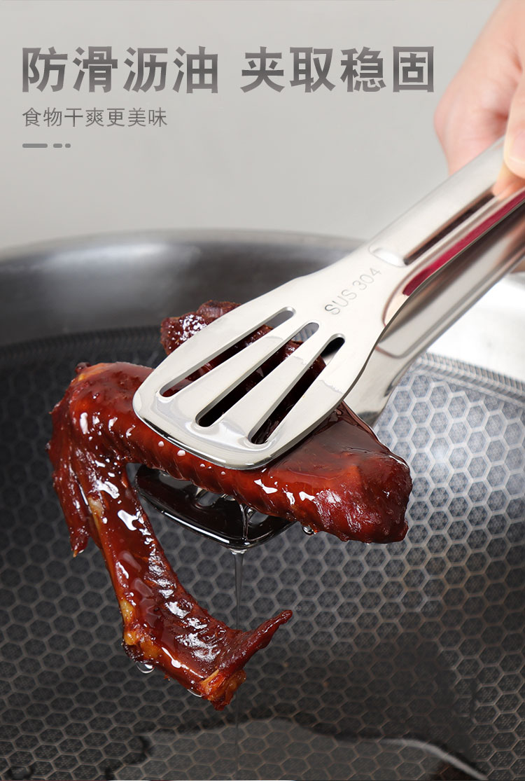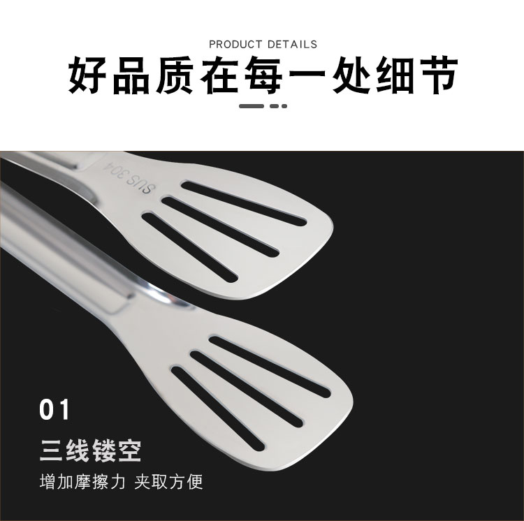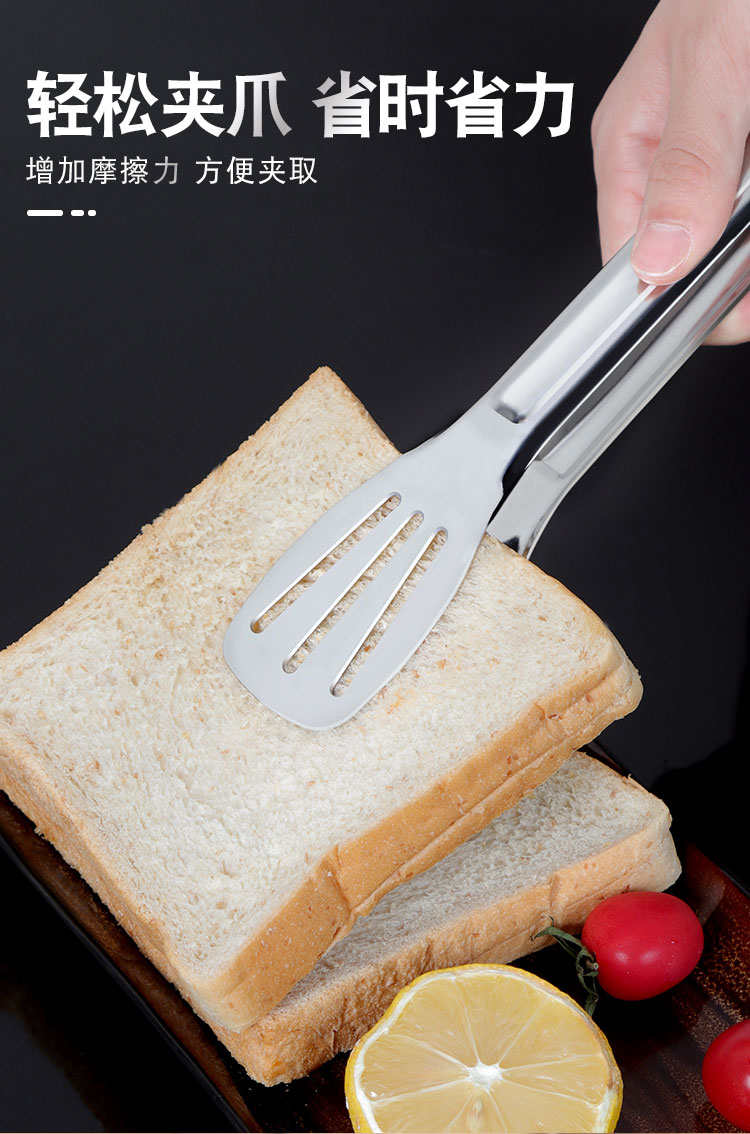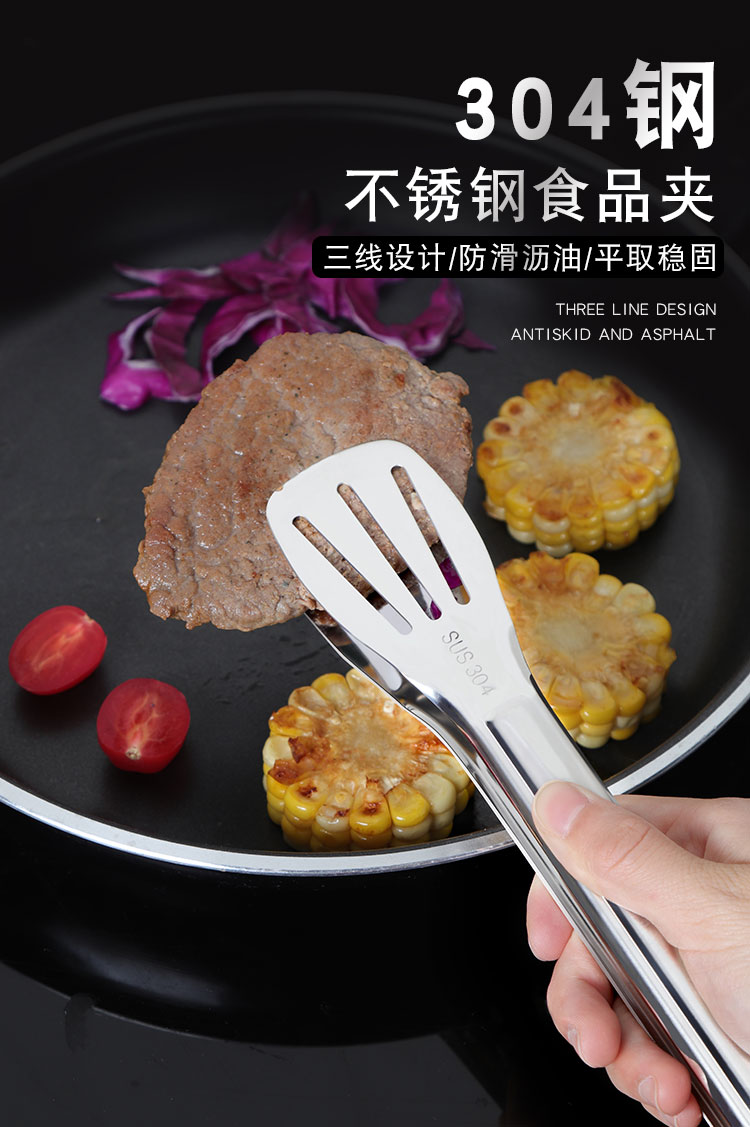 304不锈钢牛排夹食品夹披萨铲烧烤夹烤肉夹子面包夹煎鱼铲手抓饼铲夹 ¥10.60加厚304不锈钢食品夹厨房家用夹牛排烤肉防滑沥油夹三线镂空烧烤夹加厚SUS304不锈钢食品夹子,面包烧烤牛排烤肉馒头食物夹,食品好助手,一步到位,搞定各种美食;厨房家用商用;防滑沥油,夹取稳固:轻松夹爪,省时省力;镜面抛光;清洗方便